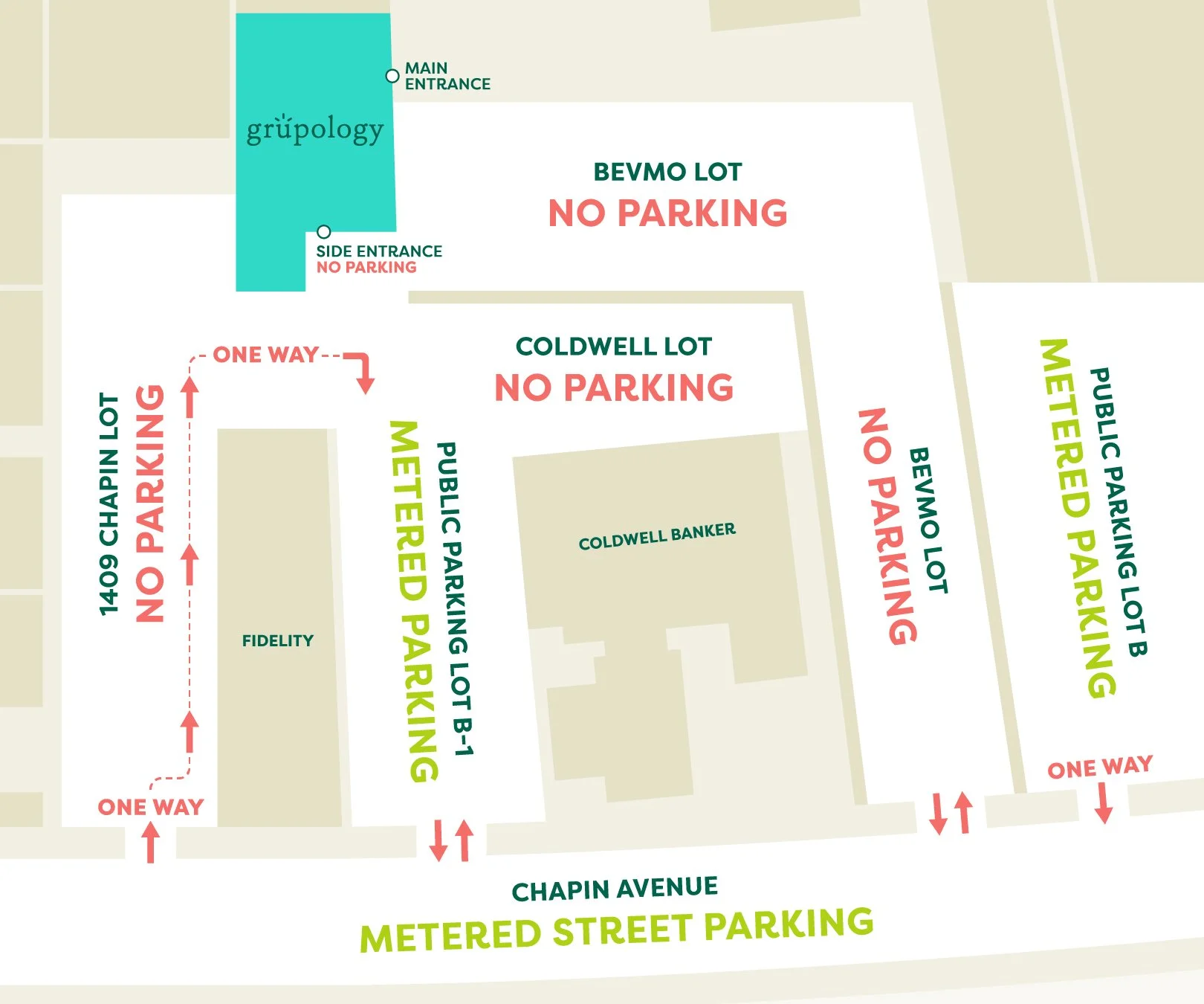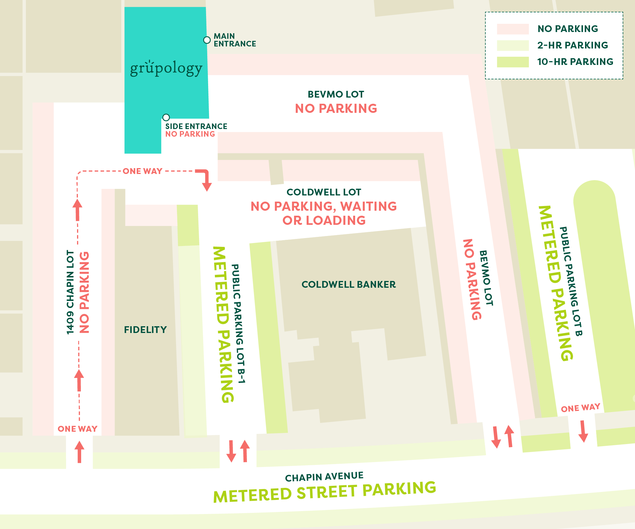 Do NOT park in our neighbors’ parking spots, including the BevMo and Coldwell Banker lots, as your car may be towed.